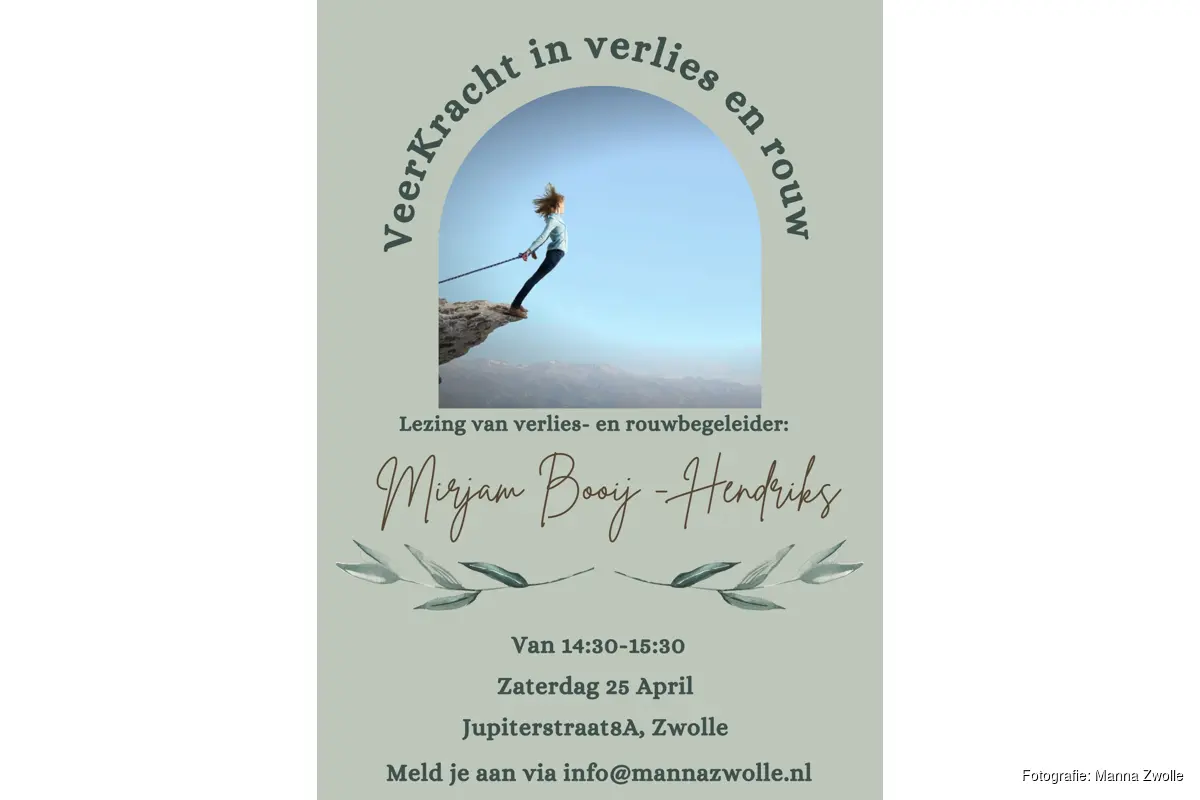 Op zaterdag 25 april van 14:30 tot 15:30 uur geeft verlies- en rouwbegeleider Mirjam Booij-Hendriks een lezing over omgaan met verlies en het vinden van veerkracht in moeilijke periodes. Tijdens deze bijeenkomst wordt stilgestaan bij de impact van verlies en worden handvatten aangereikt voor het rouwproces.